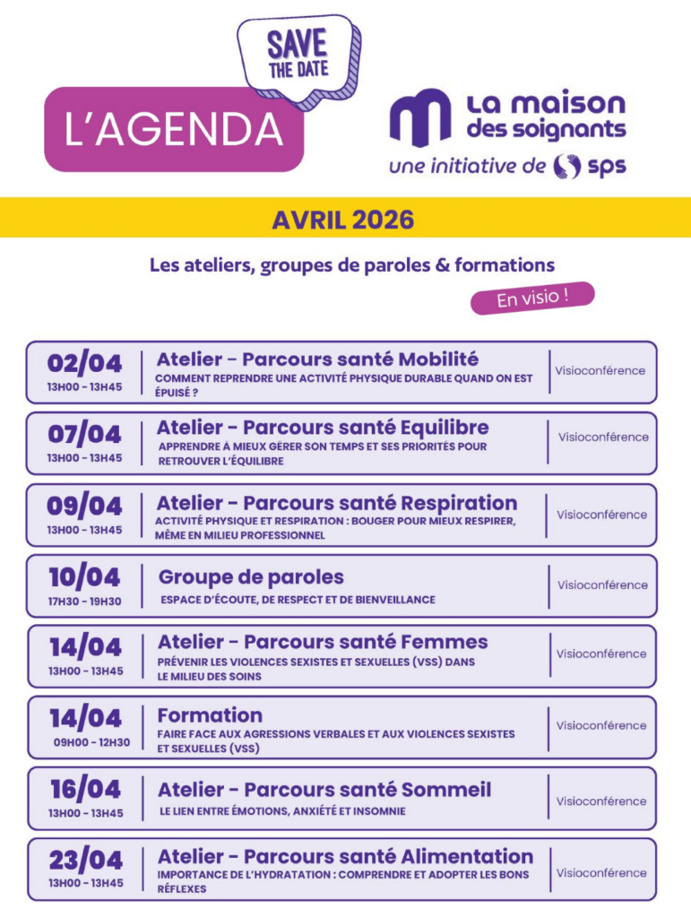 Découvrez ci-dessous l’agenda des ateliers et temps forts proposés en avril par la Maison des Soignants 👇